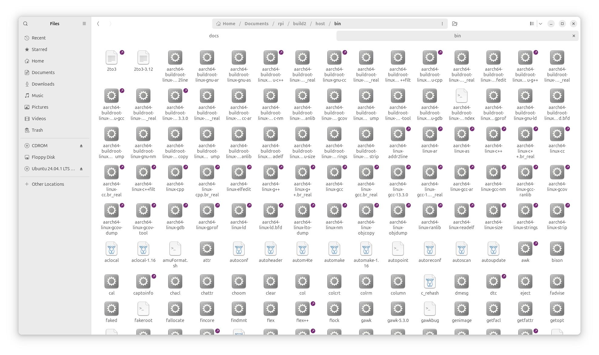 The first question is where the cross-compiler and other cross-tools are located. The answer is this: in the folder build/host/usr/bin. If you inspect this folder’s content, you can see the entire compiling, linking, and debugging tools (see Fig. 4.2). These programs are executed in your x86_64 computer, but they generate code for the ARM processor.