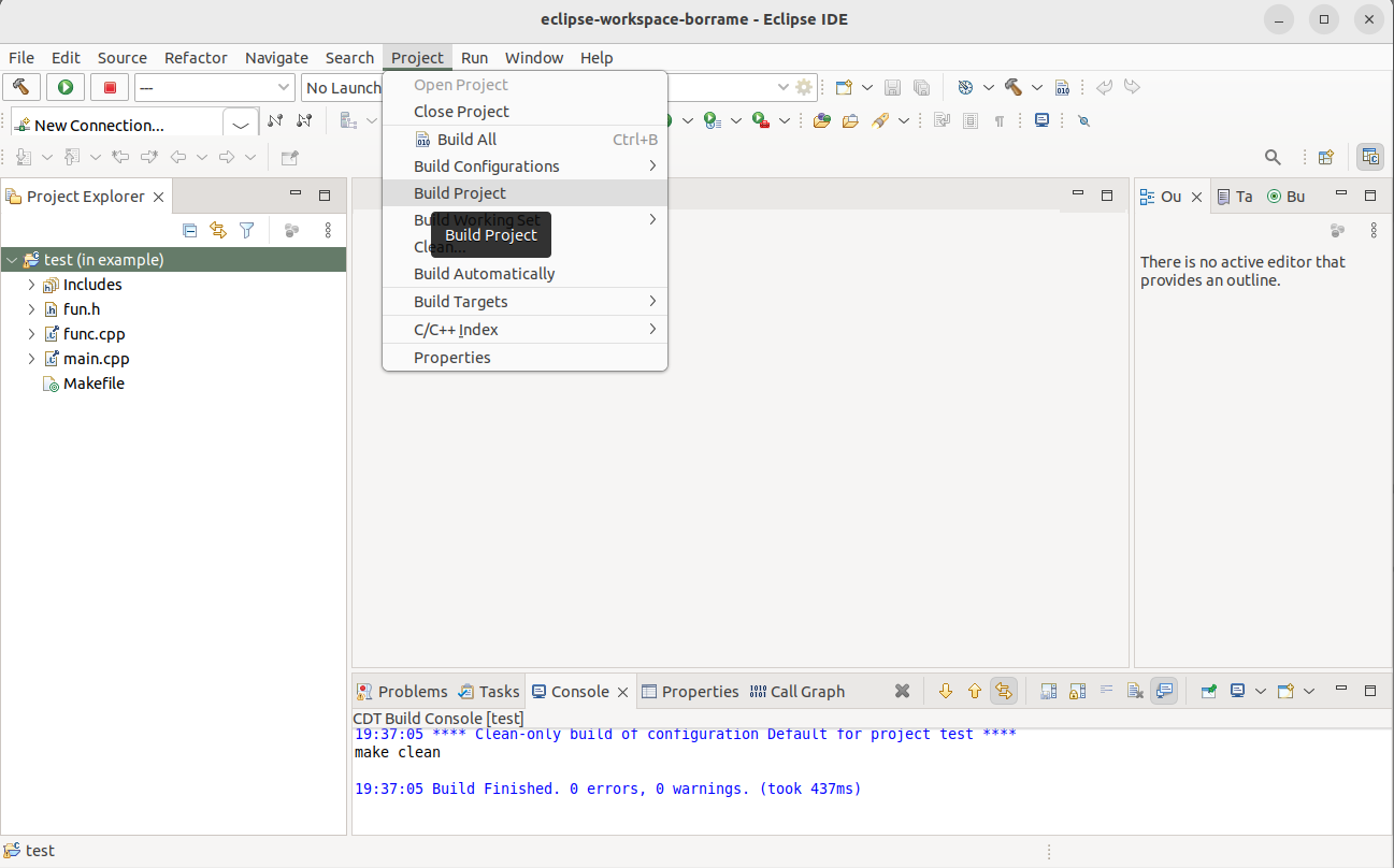 Once you have configured the cross-chain in Eclipse you can build your project using Project->Build Project. If everything is correct, you will see the eclipse project as represented in Fig. 4.7 . You can clean the project (remove the executable and objects) with Clean.