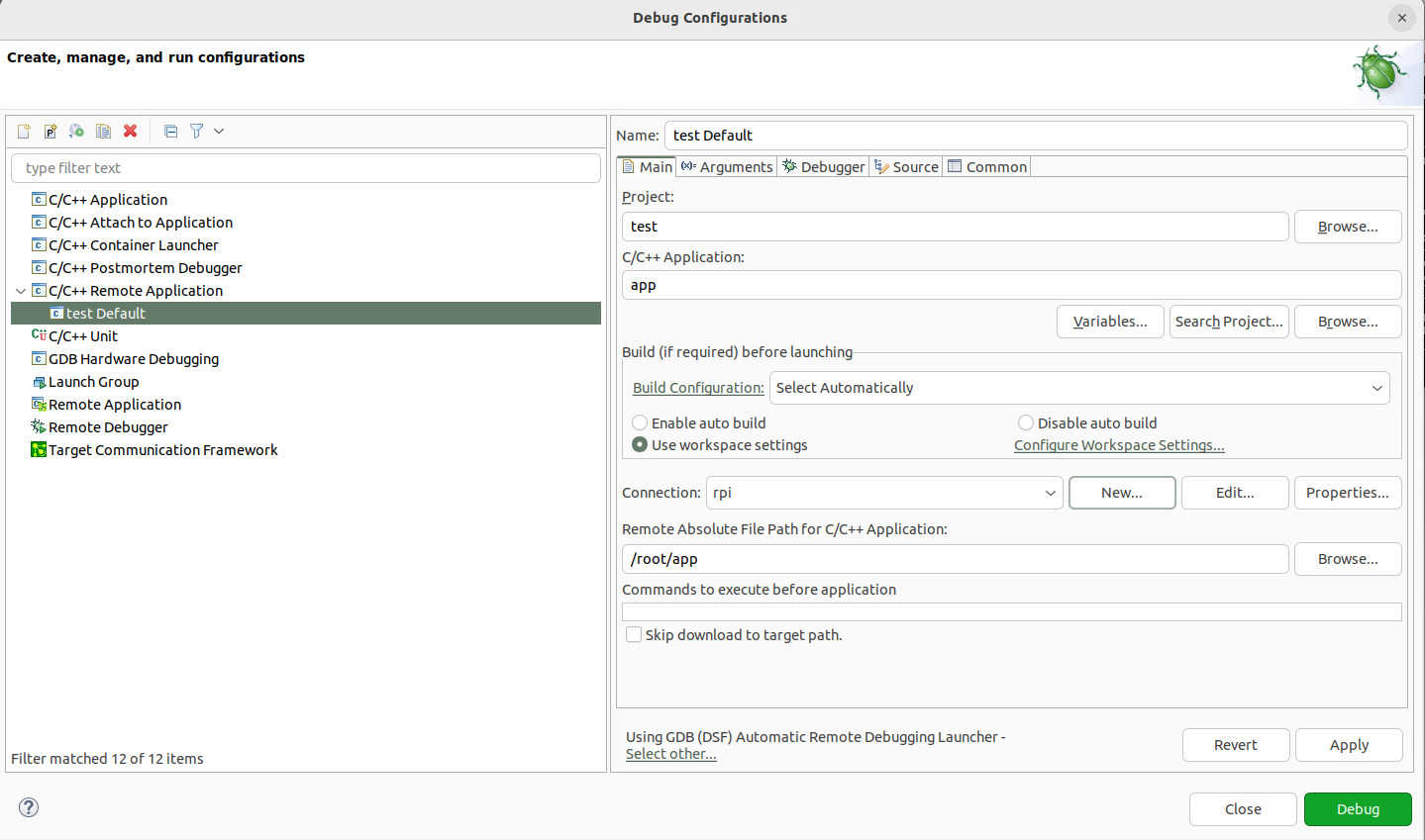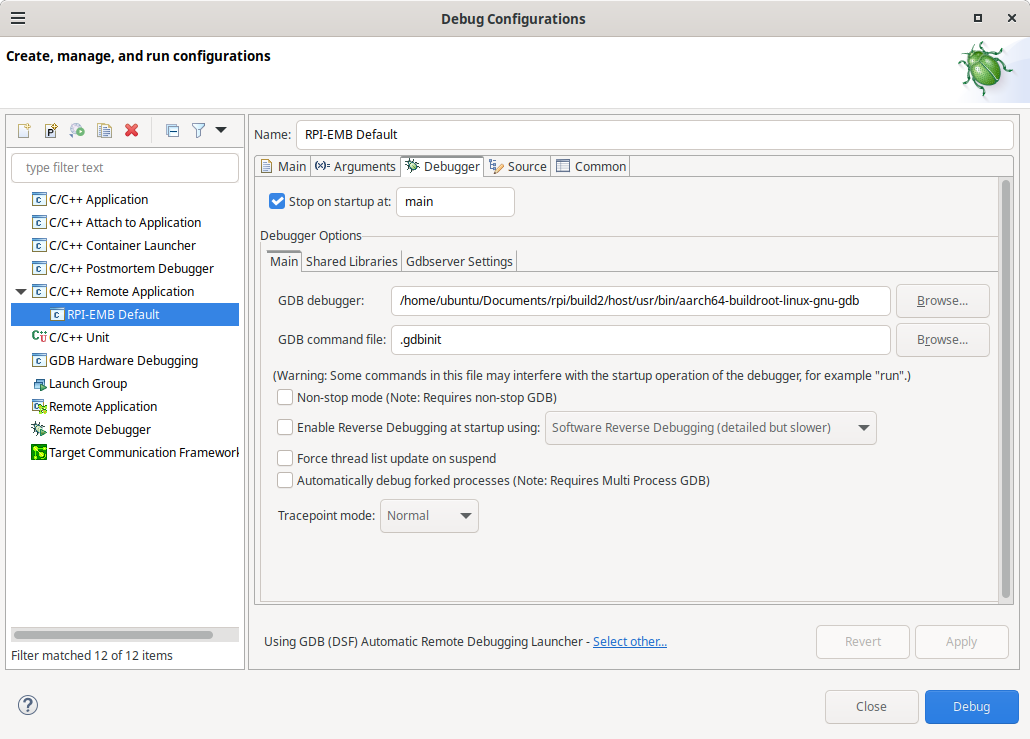 Fig. 4.11 Debug configuration, including the path to locate the cross gdb tool.