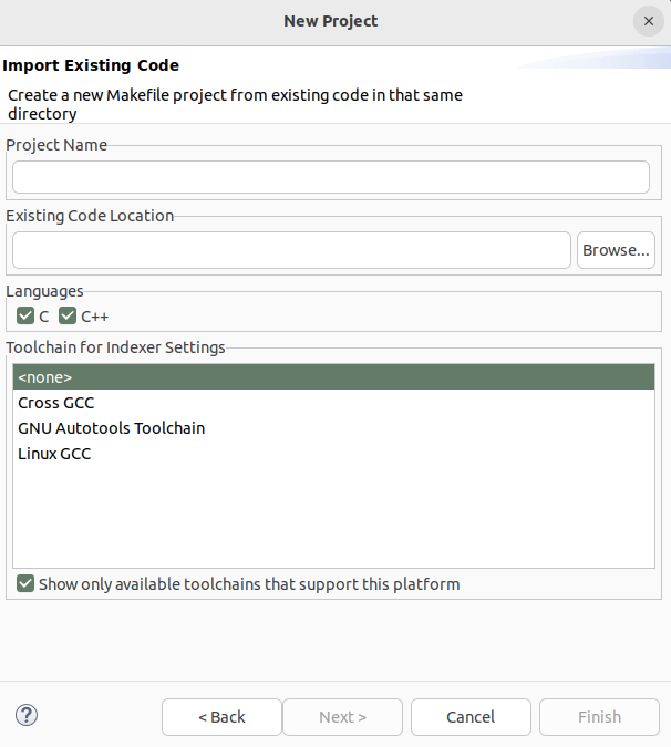 In Eclipse select in the left part of the windows Import projects. A new window is popup, select then C/C++ and the option Existing Code as Makefile Project. The window shown in Fig. 4.6 is displayed. Complete the name of the project, select the folder with the code and check Cross GCC in Toolchain for Indexer Settings.
